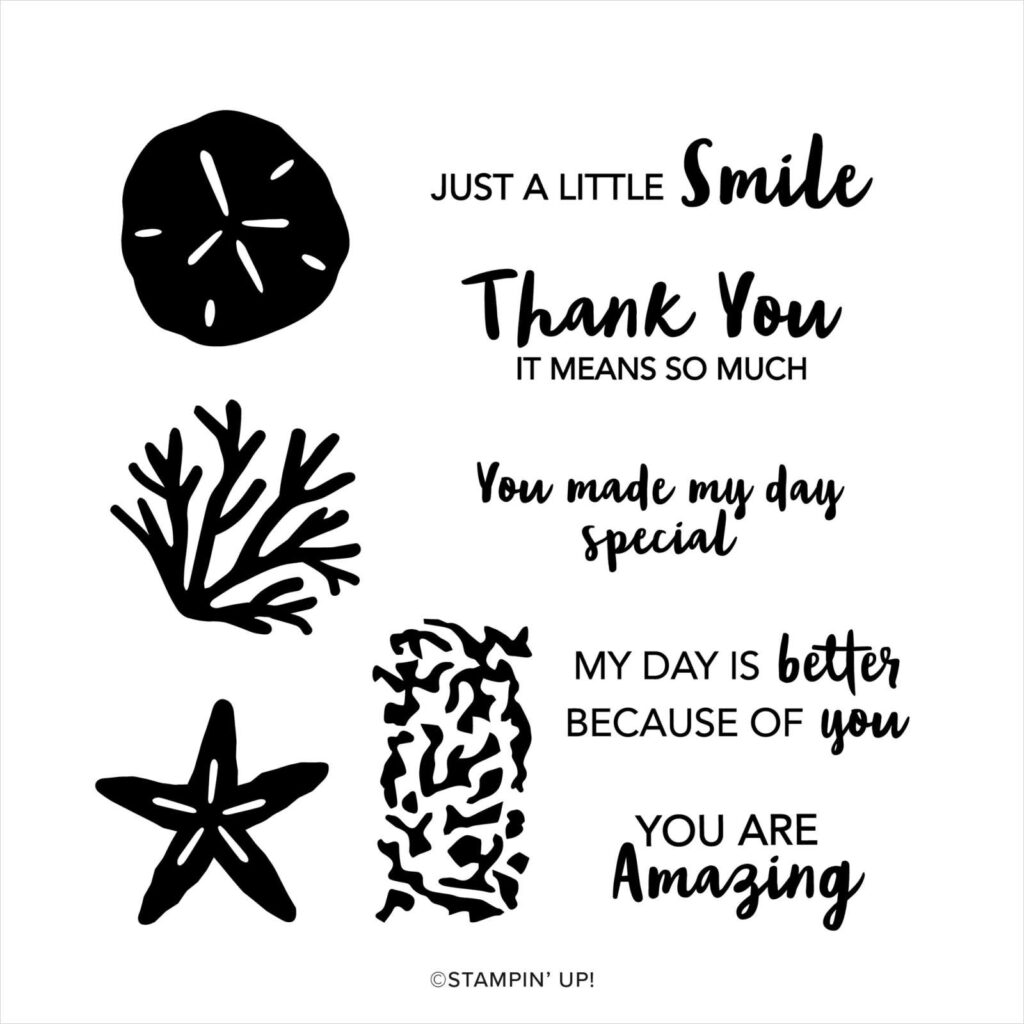 Create mini cards to use yourself or package them for a thoughtful handmade gift with the A Little Smile All-Inclusive Card Kit Stampin’ Up!. The kit features seaside imagery in tropical blues and greens. Included stamp set has beach imagery like coral, star fish, a sand dollar, and a texture piece to add more visual interest. Add stamped images and gratitude-themed sentiments to printed card bases. For more texture and shine, layer included vellum and glimmer paper die cuts. Once your kit is complete, keep the stamp set for future creative projects. Also available in French.