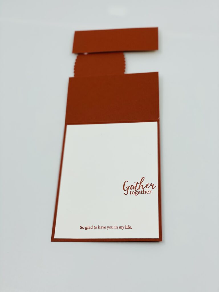 - Line up the Whisper White CS 4″ x 5 1/4″piece to “inside”, but do not glue down until you stamp your greeting. Use the Gnome as your guide to see where to stamp, once you have stamped your sentiment to the right of the Whisper White with Cajun Craze, lift up Gnome & stamp 2nd sentiment with Cajun Craze. The saying will be underneath your bottom flap and will be visible when you open card. You are now ready to adhere your Whisper White CS to inside of card.